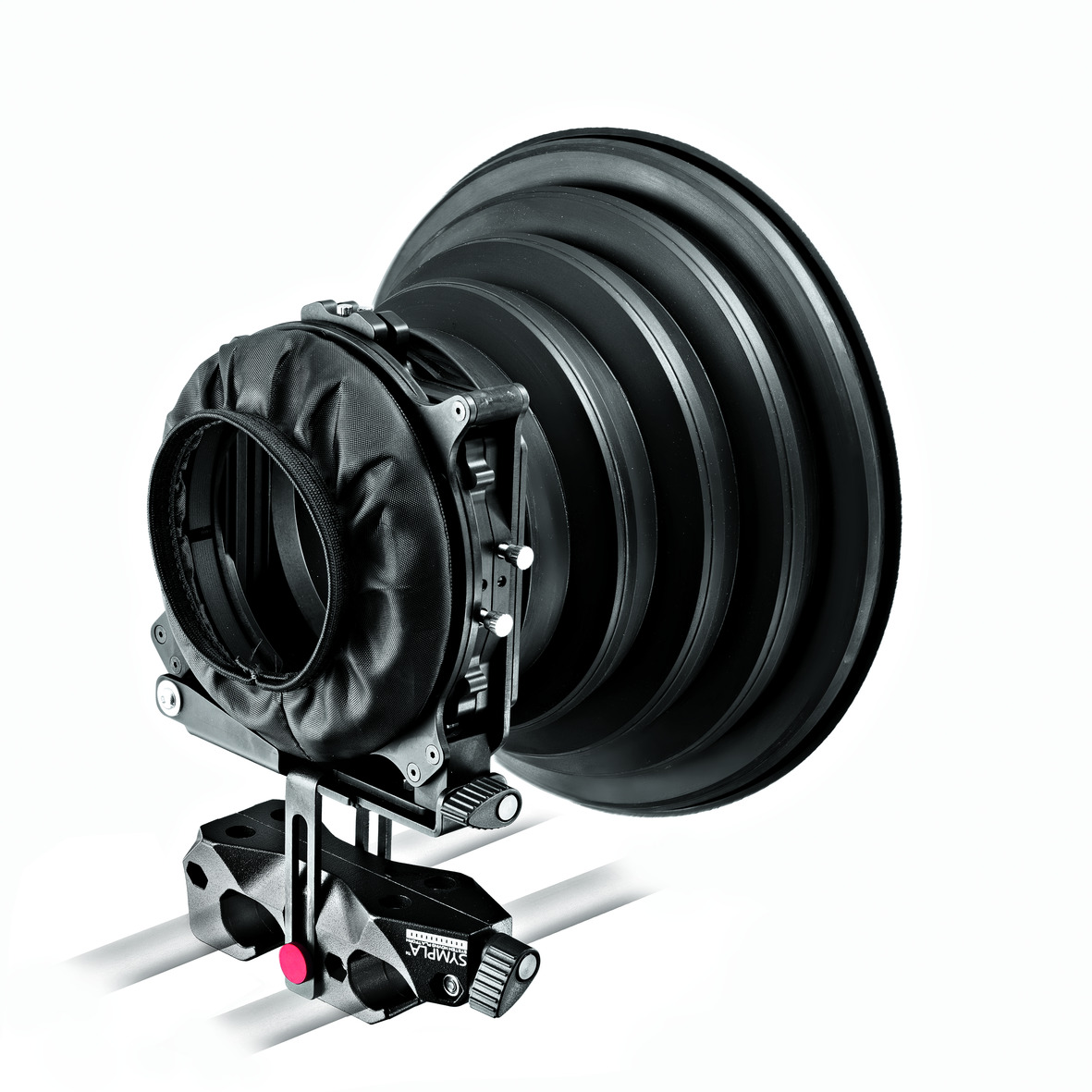 Aparte de las mil combinaciones del rig, llama mucho la atención el mattebox en forma de cono retráctil, rememorando las famosas cámaras de fuelle. Este fuelle retráctil puede hacer las veces de parasol sin necesidad de visera pues se puede orientar de manera que siempre nos haga sombra sobre la entrada de luz en la óptica. Fácil y Sympla.
