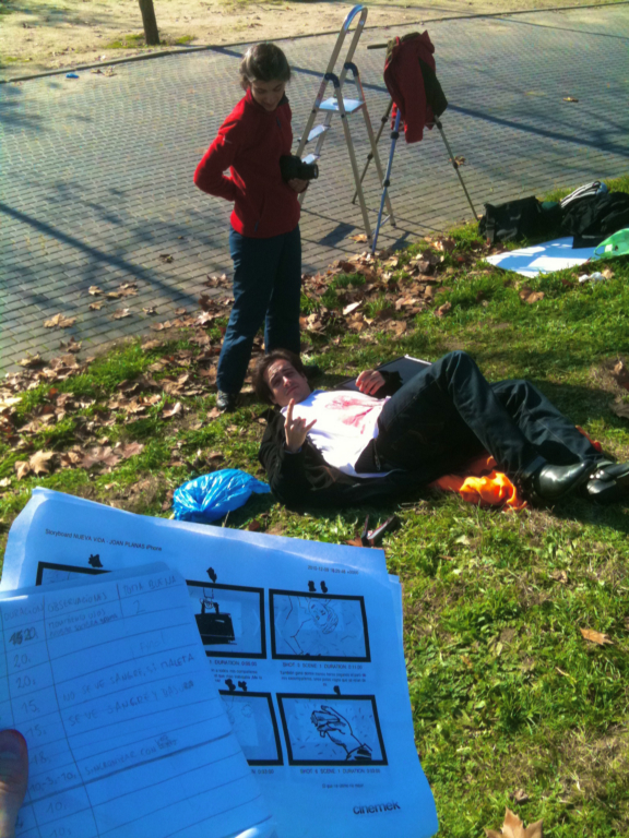 El storyboard lo maqueté en el iphone con el programa Storyboard de Cinemek que permite exportarlo en PDF, muy práctico pero me impedía recrear planos que rotan y se alejan a la vez, así que monté un video-storyboard en Final Cut Pro que además ayudó a tener claro si el corto funcionaba. Aunque por mucha tecnología que tuviera terminé imprimiendo tanto el guión como el storyboard; necesito garabatear, poner las hojas al lado de la otra para ver otras posibilidades y coherencias. http://www.youtube.com/watch?v=RPYkFkpbzXI