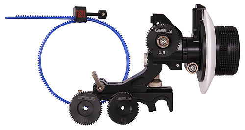 El pasado mes de abril, el resultado de las noches de insomnio de Marko vio la luz bajo el descriptivo nombre de Intuit Focus, y se suele referir a él como un “mando de foco electromecánico manos libres“. Básicamente consiste en una polea que se ajusta a nuestro estativo/steadycam/trípode y que a través de una correa dentada, se tensa con el anillo de enfoque del objetivo, de tal manera que ni fuerza el barrilete ni lo sujeta “con pinzas”. Puede emplearse con cualquier óptica DSLR, así como PL.
