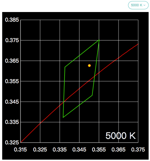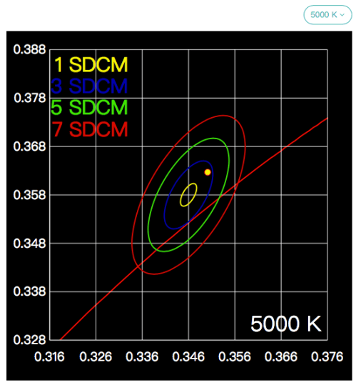 Continuemos con las Elipses de MacAdam para la percepción de color de la IEC SDMC. La Elipse de MacAdam se refiere a la región de un diagrama de cromaticidad que contiene todos los colores que el ojo humano es capaz de distinguir del color que se encuentra en el centro de la elipse. En el gráfico podemos apreciar varias elipses ampliadas a tres, cinco y siete veces el original, o sea una desviación estándar de 3 SDCM, 5 SDCM ó 7 SDCM. Mientras una diferencia en 1 SDMC sería invisible, 3 SDMC sería apenas perceptible y por encima de 5 SDMC sería notable. En el caso de los graficos adjuntos tenemos desviación pues hemos puesto como rango 5000K.