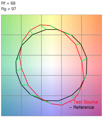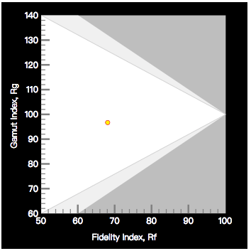 En el gráfico del TM3015 Rf/Rg de los índices Gamut (Rg) y de Fidelidad (Rf) enfrentados podemos ver un punto amarillo que nos situa la fuente analizada más cercana al vértice cuando mayor calidad nos ofrece.