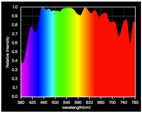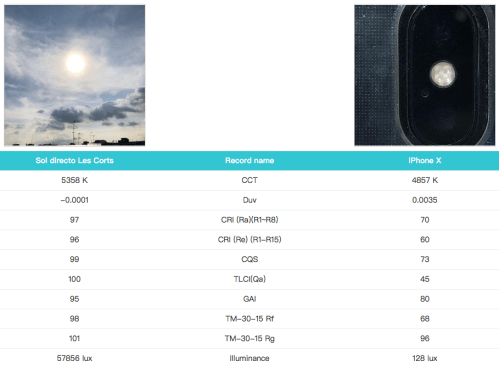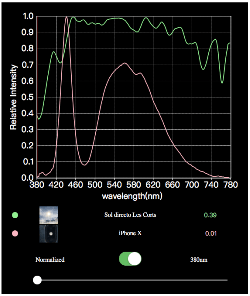A continuación voy a poneros unos cuantos gráficos, y como no quiero tener represalias por parte de ningún fabricante de nuestro sector he realizado una comparativa loca entre la luz del Sol y la linterna del iPhone X; ahora entiendo porqué no me gustan nada las fotos con flash de los móviles, ¡NO tienen rojo! Por otro lado debemos tener en cuenta que la luz solar tiene un CRI teórico de 100, pero claro, con la contaminación de la ciudad, en este caso Barcelona, perdemos algo de calidad.