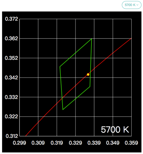 Y acabemos con el Índice cromático para lámparas de estado sólido, C78377-2017, el cual también lo podemos ver en formato C78377-2008. Nos muestra en el gráfico un cuadro verde que representa el BIN dentro del cual la desviación de la curva de Planck es aceptable para la temperatura de color seleccionada (en el caso del Sol he seleccionado 5700K y para el iPhone 5000K); la línea roja es la curva de Planck. El punto amarillo representa la medición de la fuente de luz y en ambos casos las mediciones son correctas pues están dentro del cuadro verde o BIN. En lo que refiere a la linea roja vemos que la medición del Sol, punto amarillo, está justo sobre la curva de Planck y eso nos indica que no hay dominante; en cambio en el gráfico del iPhone vemos que está muy por arriba de la línea roja y eso nos indica una dominante azul-verde, pero pensad en escala BIN y por lo tanto es una dominante inapreciable para un ojo no acostumbrado a discernir el cromatismo. Que el punto esté más a la izquierda o a la derecha sólo indica su temperatura de color con respecto al estándar elegido (en el caso del Sol 5358K sobre 5700K de referencia y en el iPhone 4857K sobre 5000K de referencia). En definitiva, este gráfico sólo nos sirve para catalogar las fuentes de luz según su BIN pero en sí mismo no nos sirve mucho como referencia de calidad.