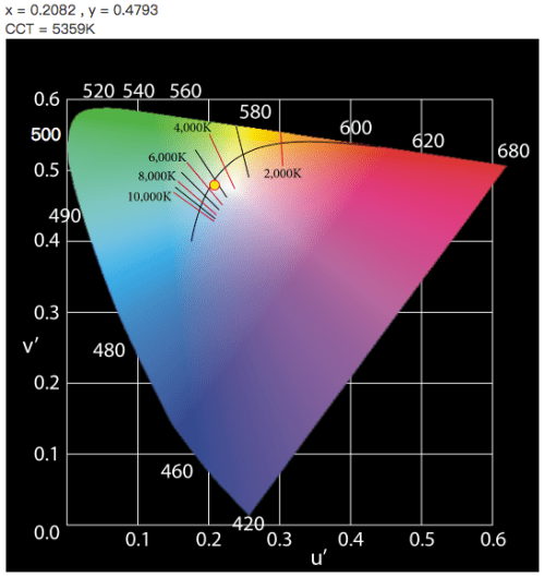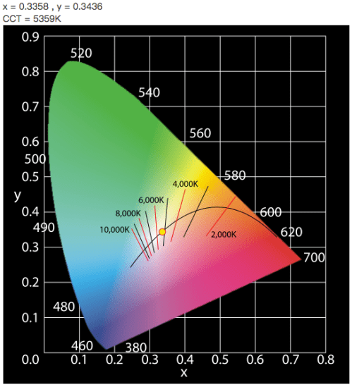 El espacio de color CIE1931 nos define la curva en la que se mueve la fuente analizada dentro del diagrama de cromaticidad, buscando el blanco en la intersección de todos los colores y huyendo de las dominantes.