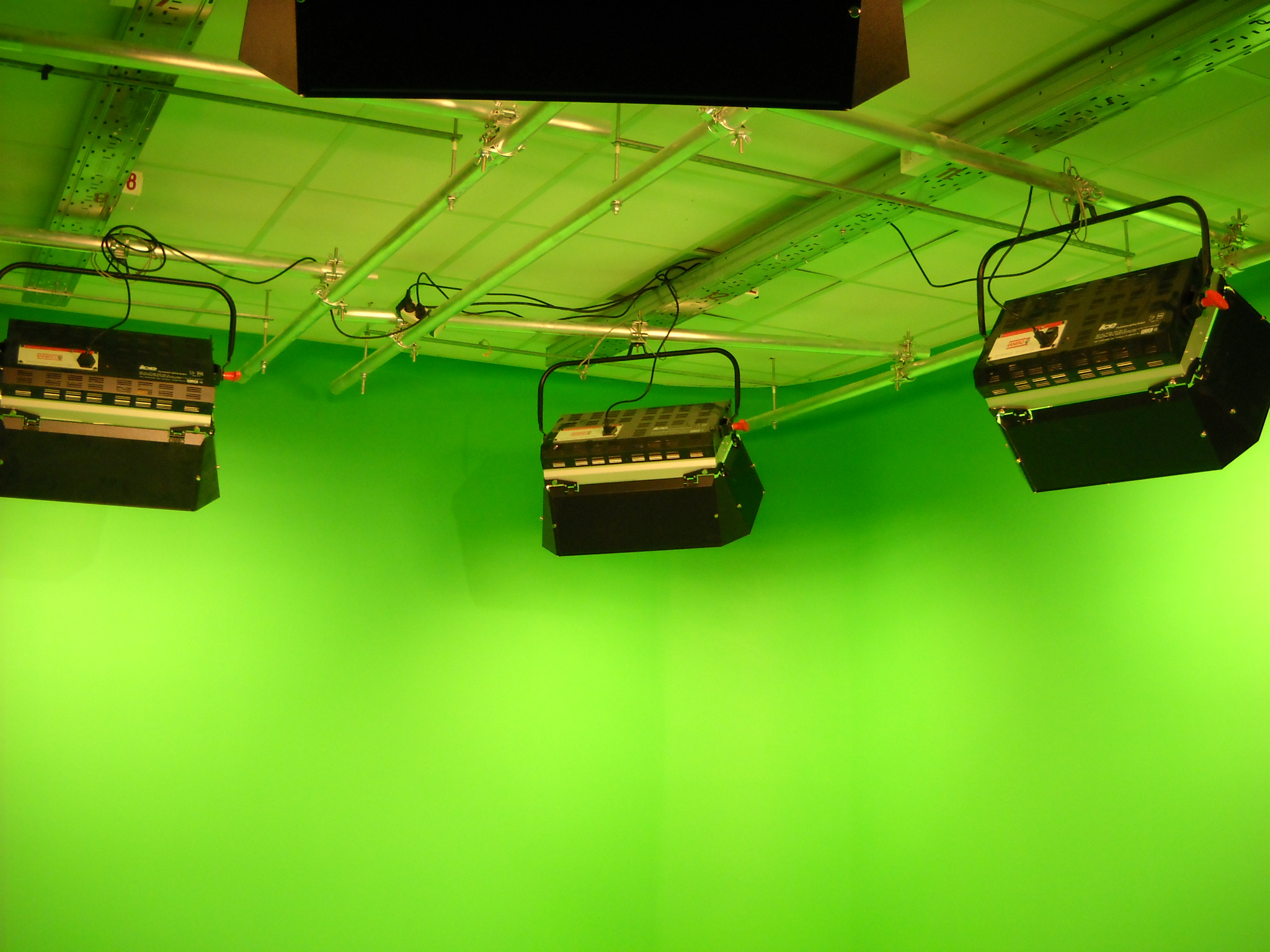 En la foto podemos apreciar las pantallas fluorescentes y el emparrillado mientras se realizaban los ajustes de iluminación del croma. La foto no es muy buena puesto que si iluminamos un croma verde siempre tendremos una dominante verde.
