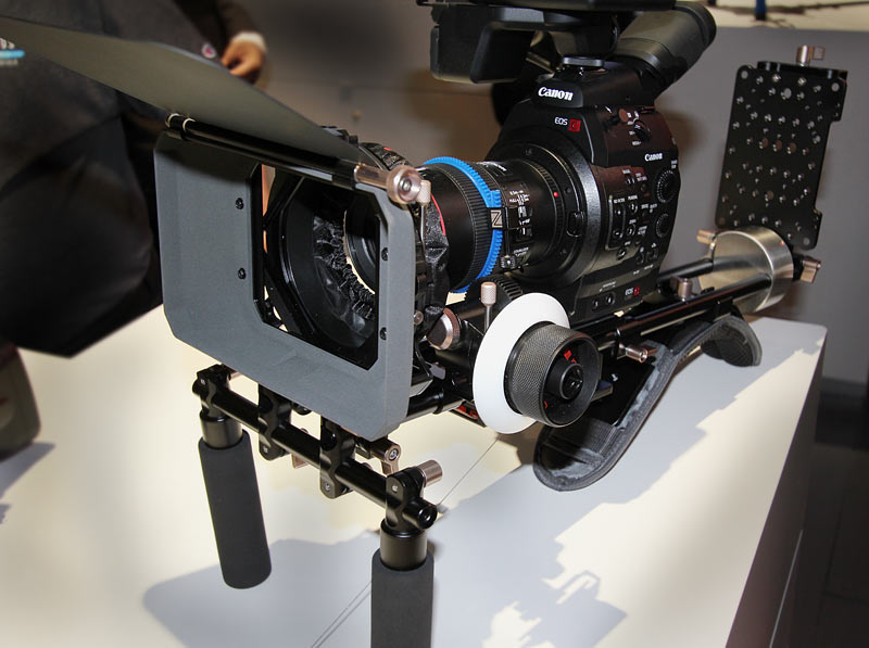 En la foto vemos la Canon C300 tuneada por Genus con soporte a hombro, plato gruyere, mattebox con visera, aro adaptador elástico, follow focus y brida. Ahora sólo falta que los fabricantes empiecen a entregar las cámaras a finales de diciembre o enero.