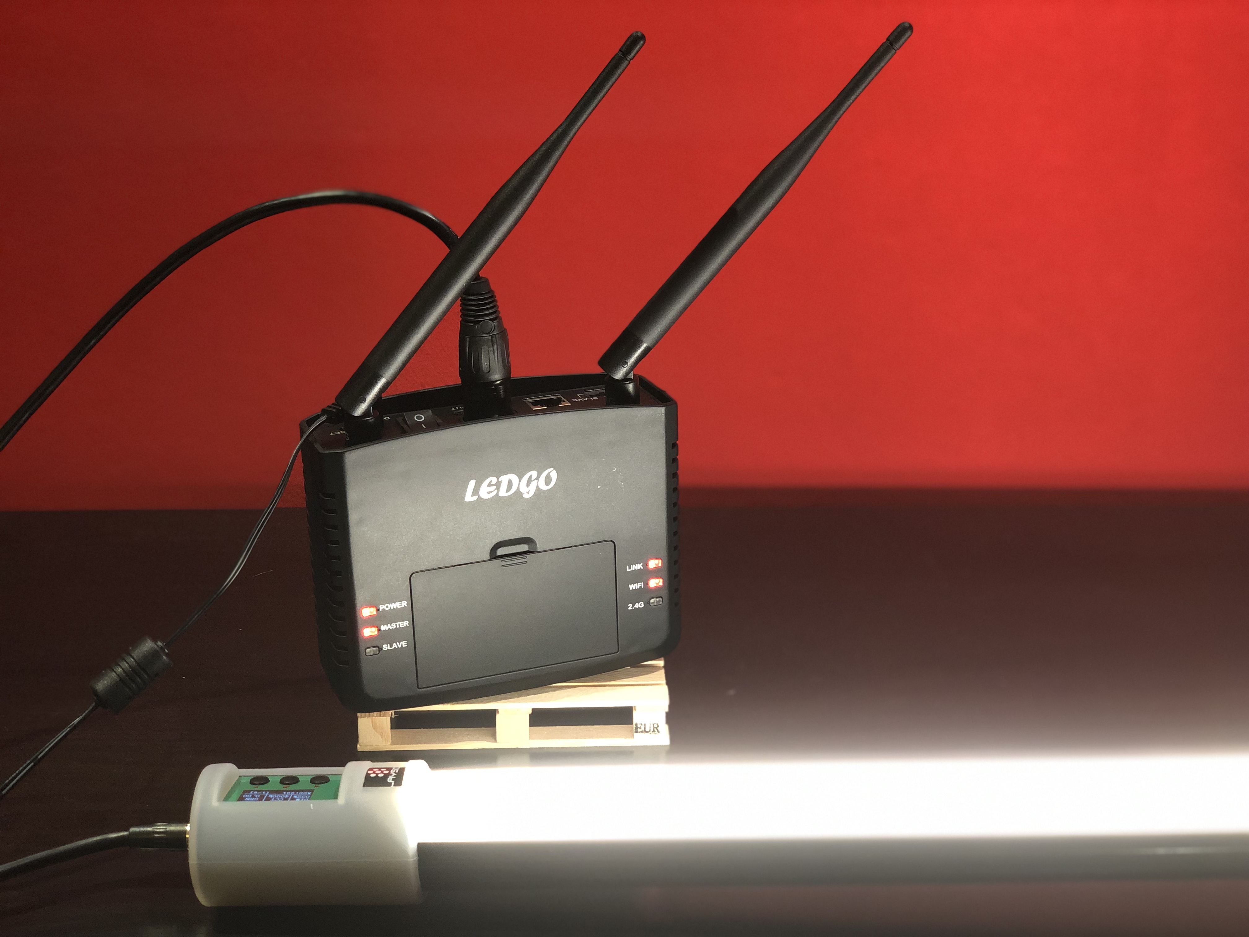 Todos los tubos tienen dimmer manual, DMX, 2.4G y WiFi para la aplicación Ledgo, de la cual hablaré luego. Esto me lleva a introducir el emisor WiFi A30 con un alcance de 100 metros, que nos permite conectar hasta 512 aparatos Ledgo bicolor y RGB, y soporta señal 2.4G y DMX. Este transmisor puede alimentarse a red o con una pequeña batería NP-F.