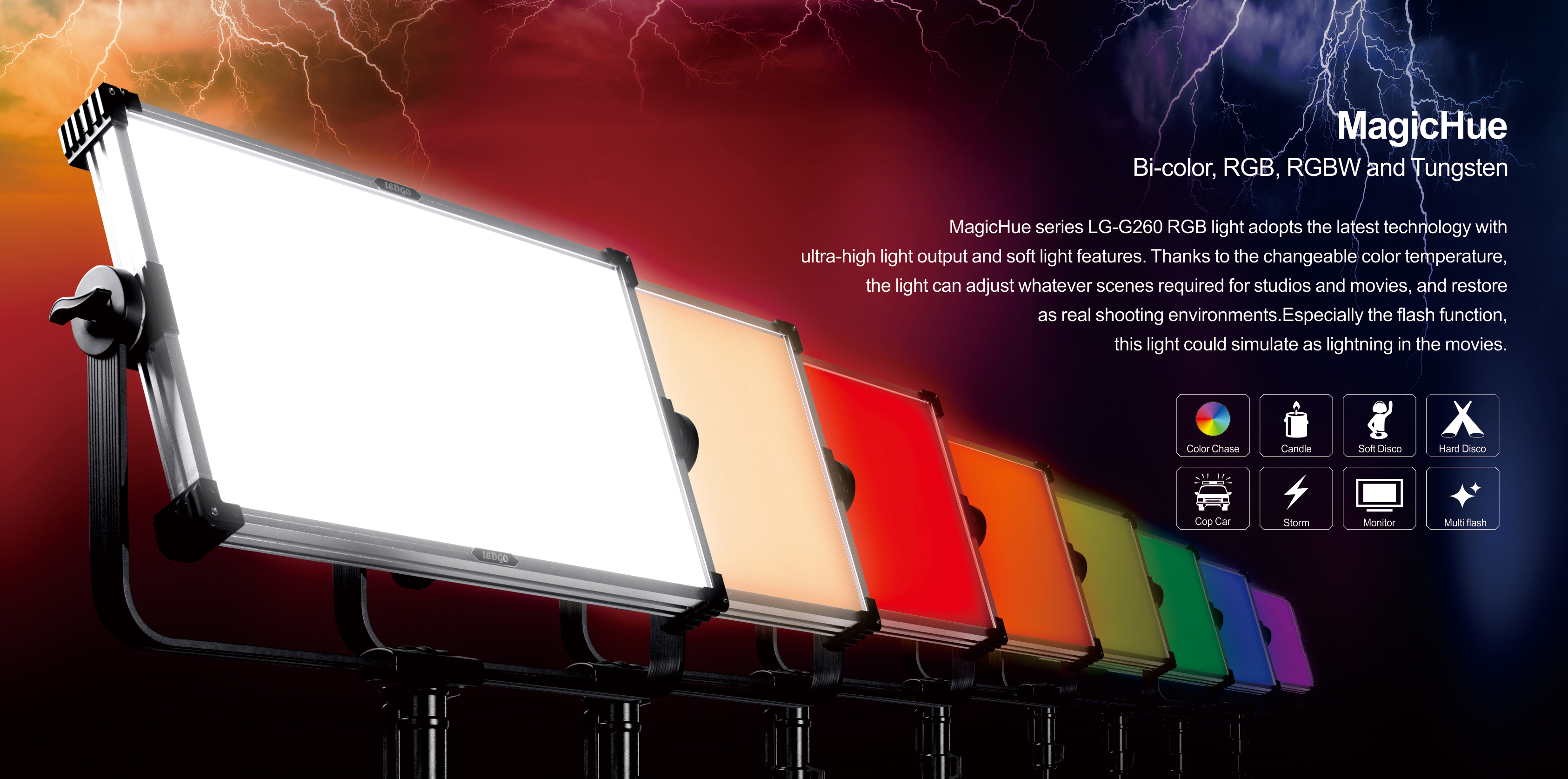 - Modo EFFECT: Efectos especiales básicos: coche policía en modo simple, doble, triple y cuádruple; llama en modo cálido, neutro y frío, además del control de frecuencia; flash con control de frecuencia; S.O.S; tormenta en modo 1, 2 y 3; y ciclo de colores con control de frecuencia y saturación. Todos los efectos con dimmer